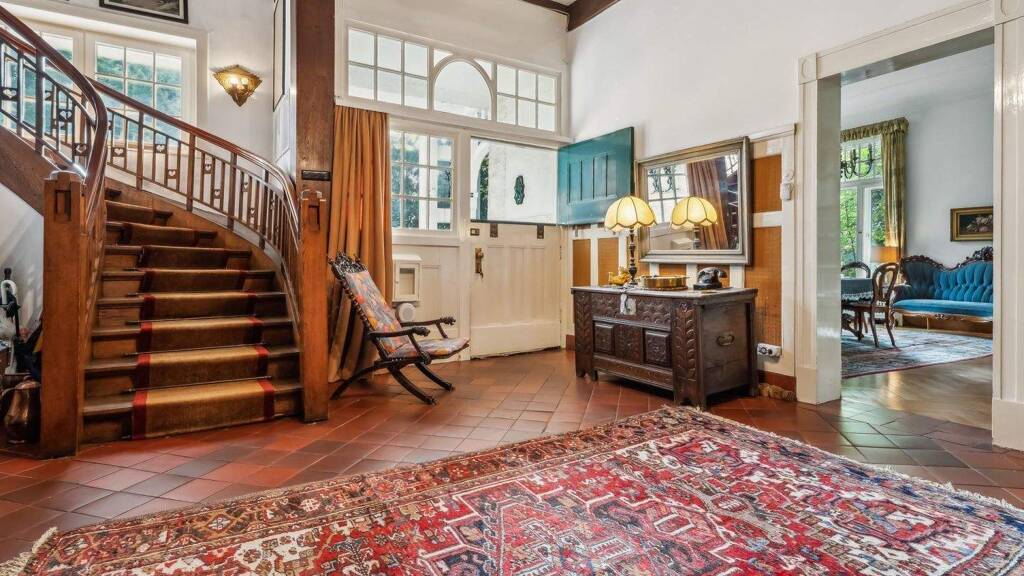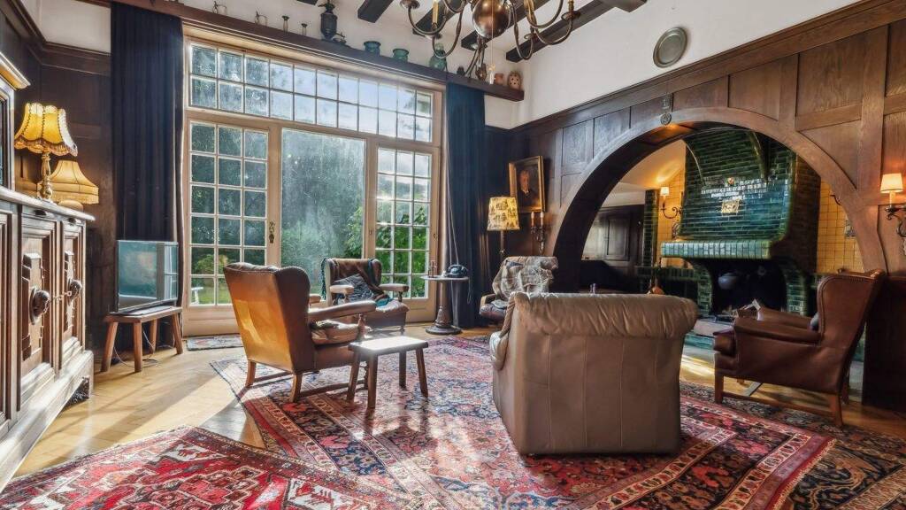 Schon beim Betreten durch den Haupteingang mit schmiedeeisernem Tor wird spürbar, dass hier Geschichte geschrieben wurde. Die Hauptwohnung umfasst ca. 251 m². Der repräsentative Eingangsbereich über die vordere überdachte Terrasse in die große Diele mit ihrer maßgefertigten Holztreppe, ist ein Blickfang für sich und stimmt auf die stilvolle Atmosphäre ein, die sich in jedem Raum fortsetzt. Hohe Decken, hochwertige Materialien und feinste Details verleihen dem Haus einen unverwechselbaren Charakter. Das Erdgeschoss präsentiert ein eindrucksvolles Kaminzimmer mit offenem Kamin und gemütlichen Sitzecken, ein klassisches Herrenzimmer mit Flügeltür zum lichtdurchfluteten Salon samt Fischgrätenparkett sowie eine großzügige Küche mit Holzelementen und Sitzmöglichkeiten. Ein weiterer Raum bietet Platz für ein repräsentatives Esszimmer oder Musikzimmer. Gäste-WC und Badezimmer, gefliest mit Delfter Kacheln runden diese Etage ab.