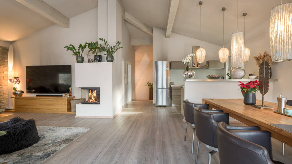 Über eine schicke Treppe geht's ins Obergeschoss, der Mittelpunkt der Immobilie. Die Raumhöhe wird Sie sofort begeistern. Der Wohn- und Essbereich ist lichtdurchflutet und hat eine offene Küche mit Profi-Geräten. Durch die bodentiefe Fensterfront auf der Westseite kommt man auf die große Terrasse. Ein ansprechend designter Kamin ist im Winter ein absoluter Traum! Er sorgt für wohlige Wärme und eine gemütliche Atmosphäre. Im Obergeschoss gibt es außerdem noch ein Schlafzimmer mit eigenem Wohnbereich, welches z.B. auch als Büro genutzt werden kann. Eine Gästetoilette und ein geräumiger Wirtschaftsraum, machen den Komfort auf dieser Etage perfekt.