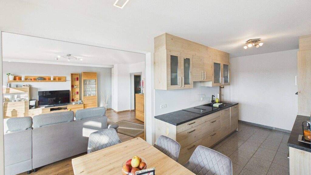 Der offen gestaltete Wohn- und Essbereich bildet das Herzstück der Wohnung. Die Küche ist harmonisch neben dem Essbereich integriert und schafft kurze Wege sowie eine kommunikative Atmosphäre. Die Küche ist bereits im Preis inkuldiert. Hinter der Küche befindet sich eine praktische Nische mit Anschluss für die Waschmaschine - dezent integriert und dennoch komfortabel erreichbar.