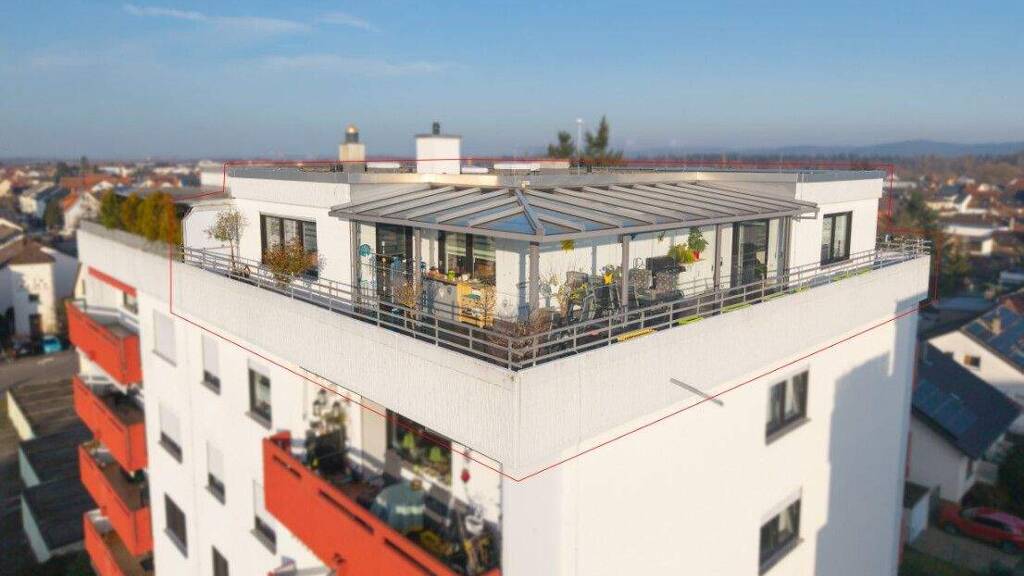 Vom Wintergarten aus sowie von einem weiteren Schlafzimmer besteht direkter Zugang zur großzügigen Dachterrasse. Ob entspanntes Frühstück, Sonnenbaden oder ein geselliger Abend - diese Außenfläche erweitert den Wohnraum ins Freie und bietet vielfältige Nutzungsmöglichkeiten.