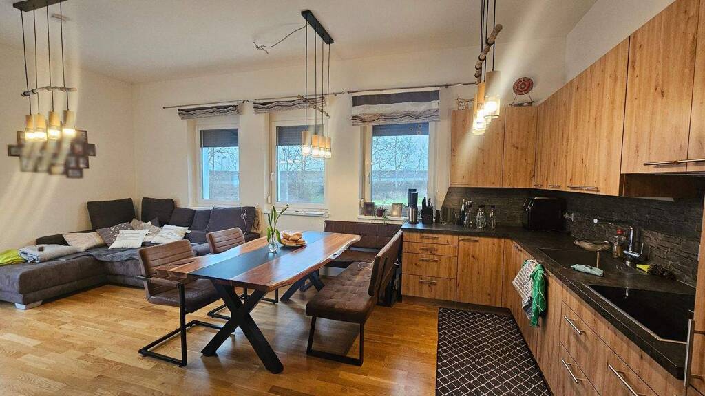 Der offene Wohnbereich bietet direkten Zugang in den Garten, wodurch innen und außen harmonisch ineinander übergehen – perfekt für entspannte Nachmittage im Grünen oder gesellige Abende im Freien. Zusätzlich gibt es einen Balkon, der von zwei Schlafzimmern aus begehbar ist und damit zusätzlichen Freiraum schafft.