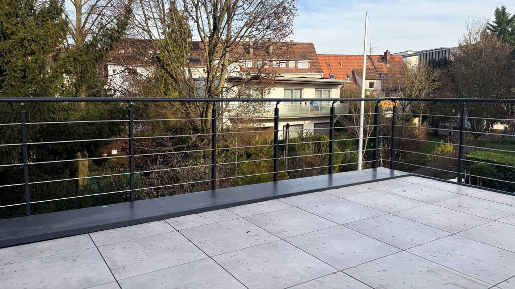 Die modern gestalteten Wohnbereiche sind durch hochwertige Designböden und großformatige Fliesen geprägt. Die Küche verfügt über einen direkten Zugang zur riesigen Dachterrasse mit Blick ins Grüne und auf die Friedrich-Ebert Anlage.
