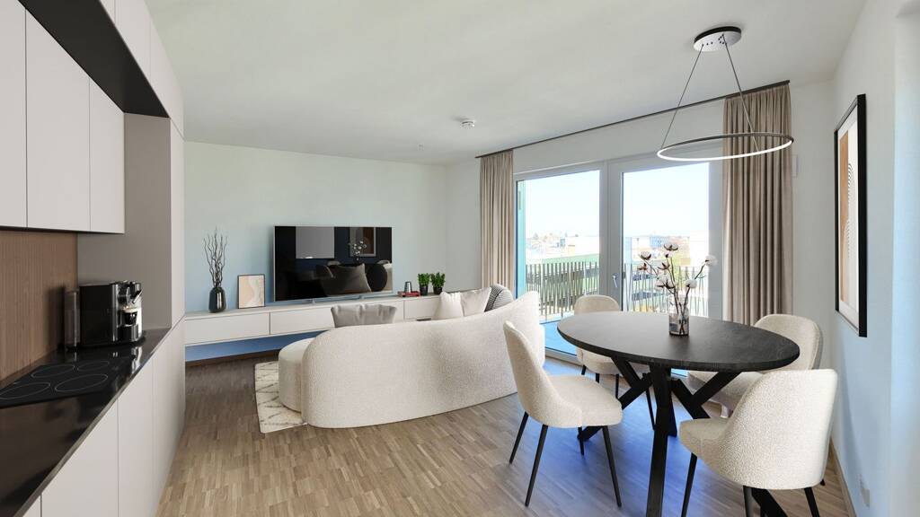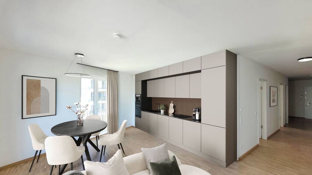 Diese moderne Etagenwohnung im 2. Obergeschoss überzeugt mit ca. 89 m² durchdacht gestalteter Wohnfläche und eignet sich perfekt für Paare oder Familien. Der offen konzipierte Wohn-, Ess- und Kochbereich mit Zugang zum ruhigen Balkon schafft ein helles, einladendes Ambiente. Ein komfortables Schlafzimmer mit Bad en Suite inklusive Badewanne, ein separates Duschbad, ein zusätzliches Zimmer sowie ein praktischer Hauswirtschaftsraum bieten viel Raum für individuelle Bedürfnisse. Abgerundet wird das Angebot durch einen eigenen Kellerraum und die Möglichkeit, einen Tiefgaragenstellplatz anzumieten.