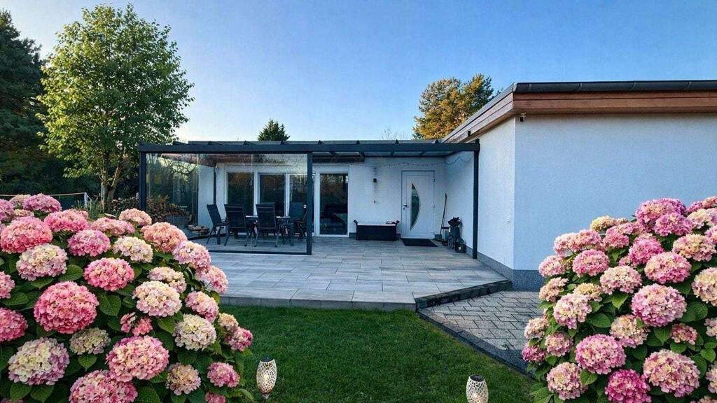 Das zweite Wohnhaus, ein Neubau aus dem Jahr 2014, der ebenfalls im selben Jahr modernisiert wurde, komplettiert das Anwesen mit zeitgemäßer Architektur und durchdachter Raumaufteilung. Hier erstrecken sich ca. 80 m² Wohnfläche über zwei helle Zimmer, ein Badezimmer und eine großzügige, halbüberdachte Terrasse (7,6 m x 6 m) mit Blick ins private Grün. Die Beheizung erfolgt ressourcenschonend über eine moderne Infrarotheizung, die für angenehme Wärme und geringe Betriebskosten sorgt. Die bodentiefen Fenster sorgen für ein helles Wohngefühl und dienen durch ihre 3-fach Verglasung als zusätzlicher Lärmschutz. Der Energieausweis weist das Gebäude in der Klasse A aus, ein Beleg für die hervorragende energetische Qualität.