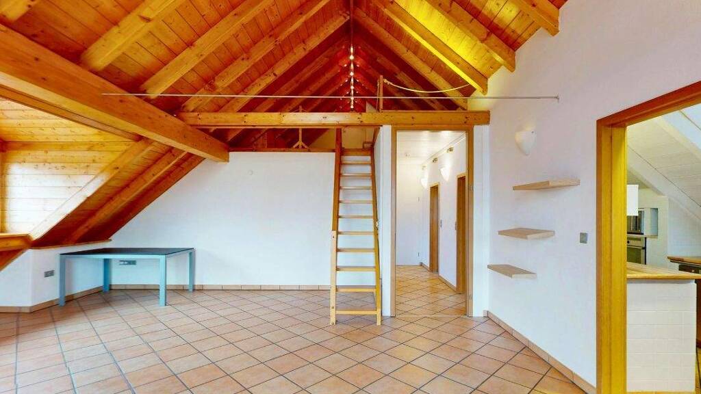 Ein besonderes Highlight dieser Wohnung ist das zusätzliche "Dach-Studio", das sich über eine stilvolle Treppe direkt vom Wohnbereich aus erreichen lässt. Dieser Bereich bietet vielseitige Nutzungsmöglichkeiten, sei es als Arbeits- oder Hobbyraum oder als gemütlicher Rückzugsort.