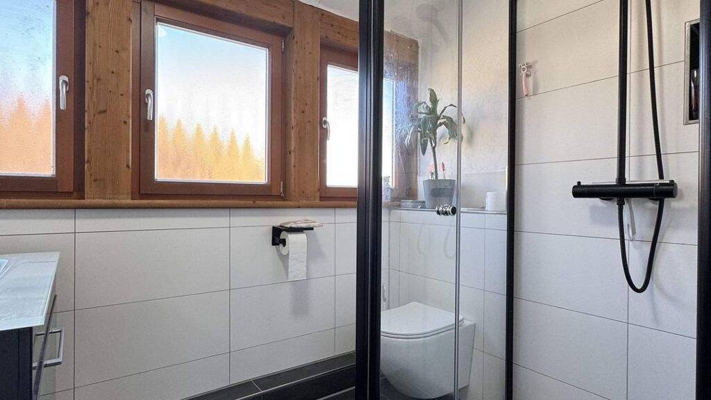 Das Obergeschoss umfasst ein Schlafzimmer mit Balkon, zwei Kinderzimmer und ein modernes Bad mit ebenerdiger Dusche.