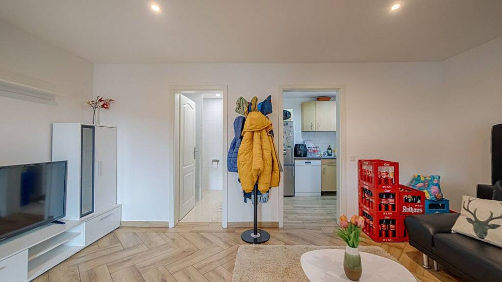Das Herzstück der Wohnung ist der großzügige Wohn-, Ess- und Kochbereich. Hier verbindet sich ein offenes, modernes Raumkonzept mit einer wohnlichen Atmosphäre und viel Platz für gemeinsames Leben. Die hochwertige Nolte-Einbauküche mit Neff-Geräten fügt sich harmonisch in den Raum ein und bietet kurze Wege, viel Arbeitsfläche und ein ansprechendes Erscheinungsbild. Hochwertige Peronda-Fliesen aus Spanien, weiß gestrichene Malervlies-Wände und -Decken sowie die stilvolle Lichtgestaltung unterstreichen den modernen Gesamteindruck. Die weißen Schüco-Kunststofffenster mit 3-fach-Verglasung und Aluminiumrollläden tragen zu Wohnkomfort und Energieeffizienz bei.