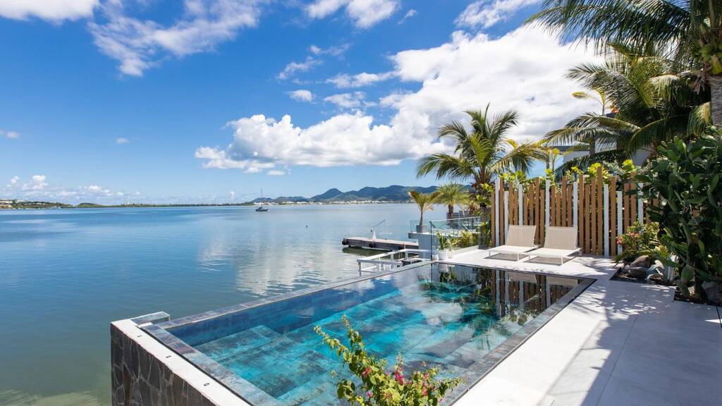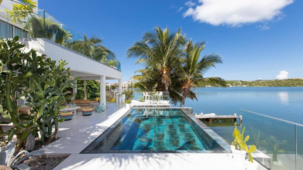 Entdecken Sie dieses außergewöhnliche Refugium am Wasser, eine komplett renovierte Luxusvilla, die meisterhaft zeitgenössische Raffinesse mit warmer, einladender Eleganz verbindet. Dieses bemerkenswerte Anwesen befindet sich an der begehrten Uferpromenade der Dutch Side und bietet eine exklusive Lagunenlage mit herrlichem Blick über die Simpson Bay bis hin zum französischen Tiefland - ein Aussichtspunkt, der die Essenz des karibischen Luxuslebens einfängt.