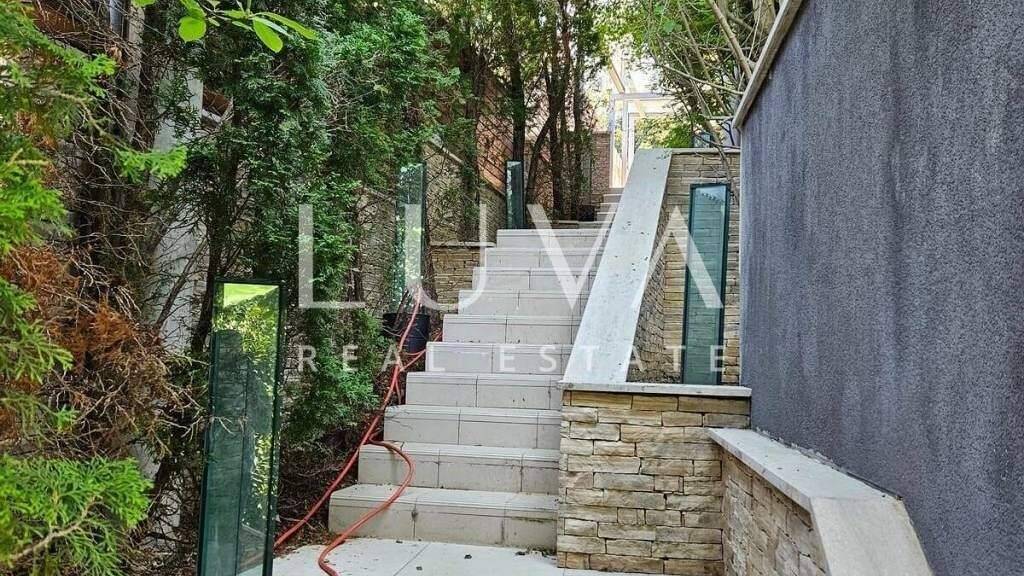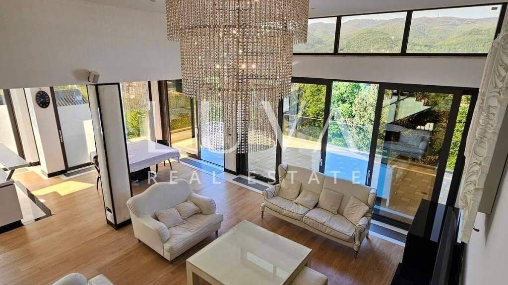 Die Villa hat eine Gesamtfläche von 548 m², erstreckt sich über 4 Etagen und wurde im Jahr 2008 erbaut. Der Eingang führt in ein geräumiges Wohnzimmer, das mit einer voll ausgestatteten Küche verbunden ist. Vom Wohnzimmer gelangt man auf eine großzügige Terrasse mit herrlichem Ausblick, und das gesamte Wohnzimmer ist von großen Glaswänden umgeben. Eine Treppe führt vom Wohnzimmer in die oberste Etage, wo sich das Hauptschlafzimmer mit eigenem Bad und begehbarem Kleiderschrank befindet. Auf der Etage unterhalb des Wohnzimmers befinden sich 3 Schlafzimmer, und auf der untersten Etage gibt es einen großen Raum mit einem Innenpool, Jacuzzi und einem kleinen Fitnessraum. Von diesem Raum aus gelangt man in einen schön angelegten Garten.