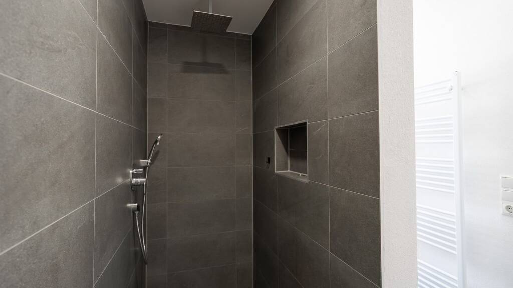 Ein entspannendes Duscherlebnis erwartet Sie im zeitlos modernen Badezimmer durch die ebenerdig begehbare Regendusche.