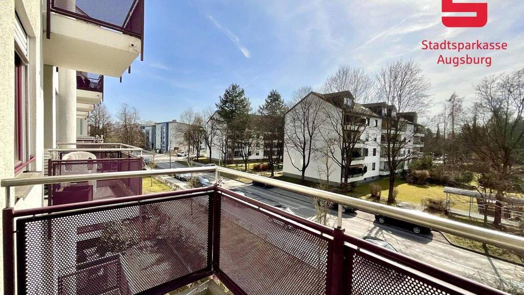 Vom Wohnbereich aus gelangen Sie auf den Süd-Balkon, der zur Straßenseite ausgerichtet und größtenteils überdacht ist.