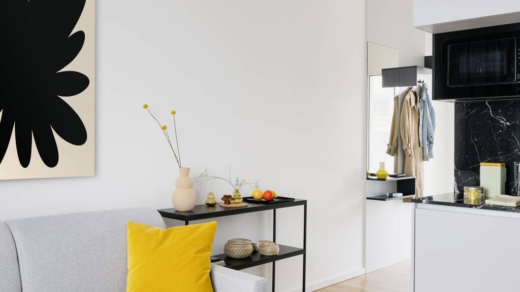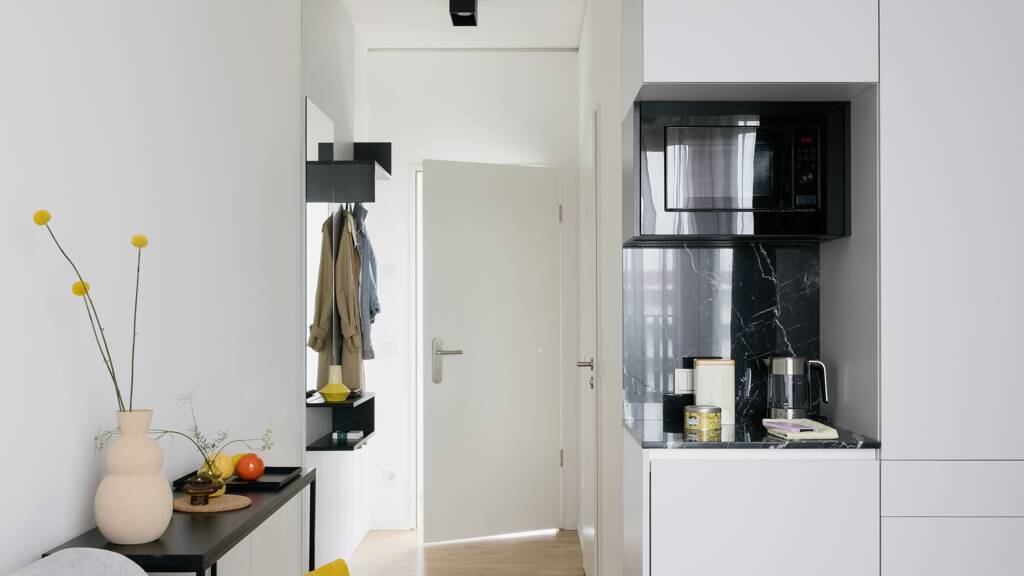 Das Apartment gehört zu einem Co Living Konzept und ist voll möbliert. Es hat keine eigene Küche – lediglich einen Kühlschrank und eine Mikrowelle – verfügt aber über ein eigenes Bad. Auf derselben Etage befindet sich eine Gemeinschaftsfläche mit voll ausgestatteter Küche und Wohnzimmer.