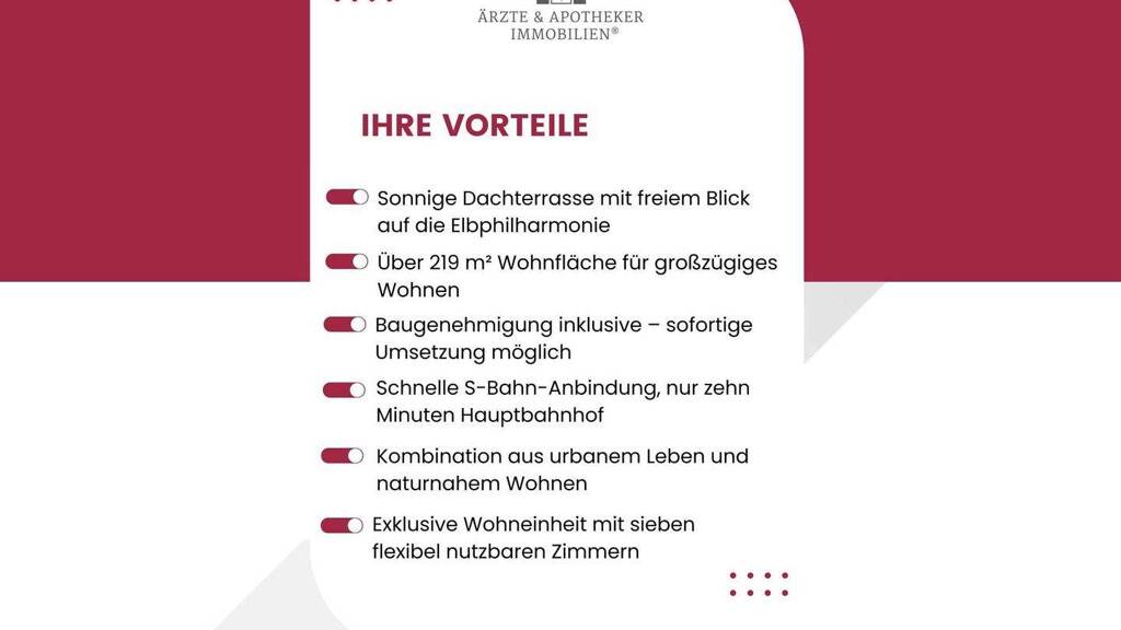 - Sonnige Dachterrasse mit freiem Blick auf die Elbphilharmonie - Großzügige Wohnfläche von über 219 m² - perfekt für ein exklusives Wohnkonzept - Baugenehmigung inklusive - sofortige Umsetzung des Ausbaus möglich - Moderne Aufzugsplanung für barrierearmen Zugang in alle Etagen - Sieben flexibel nutzbare Zimmer und zwei Badezimmer für vielfältige Wohnideen - Kombination aus urbanem Leben und naturnaher Lage mit hervorragender Infrastruktur - mit dem Aufzug bis in das Dachgeschoss