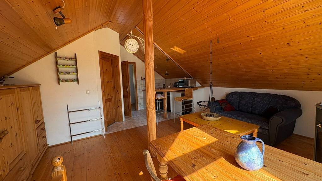 Über eine offene Holztreppe gelangen Sie ins Dachgeschoss, das mit einem großzügigen Wohn-, Schlafzimmer, einer Küche, Zimmer sowie einem weiteren Duschbad begeistert. Dieser Bereich kann familiär bei Bedarf als separate Einheit gestaltet werden - ideal für größere Familien oder Gäste.