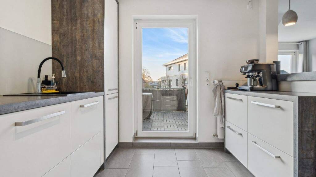 Ausstattung & Besonderheiten Die Wohnung ist nahezu vollständig mit hochwertigen Bodenfliesen ausgestattet; lediglich der begehbare Kleiderschrank verfügt über einen hochwertigen Kunststoffboden in moderner Schiffsdielenoptik. Sämtliche Rollläden sind elektrisch bedienbar, ebenso das Außenrollo des Dachflächenfensters im Badezimmer. Alle Innenwände sind mit Vliestapeten versehen, die Bäder teilweise zusätzlich mit Wandfliesen ausgestattet.