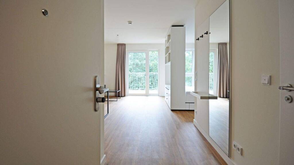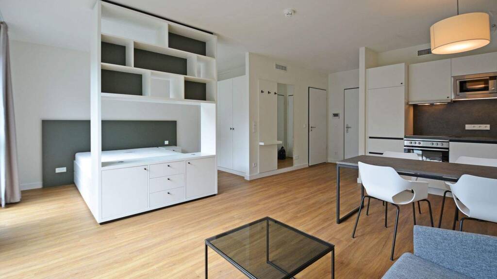 Zur Möbel-Mindestausstattung gehören: - Garderobenmöbel mit Ablage & Ankleidespiegel - Raumteiler als TV-Möbel - Küchenzeile mit Herdset, Mikrowelle, Kühl/Gefrierkombi und Dunstabzug - Esstisch mit Stühlen - Sofa (2-Sitzer) - Verdunkelungsvorhänge - Nachttisch - Bettgestell - Einbauschrank
