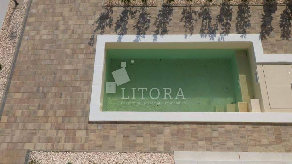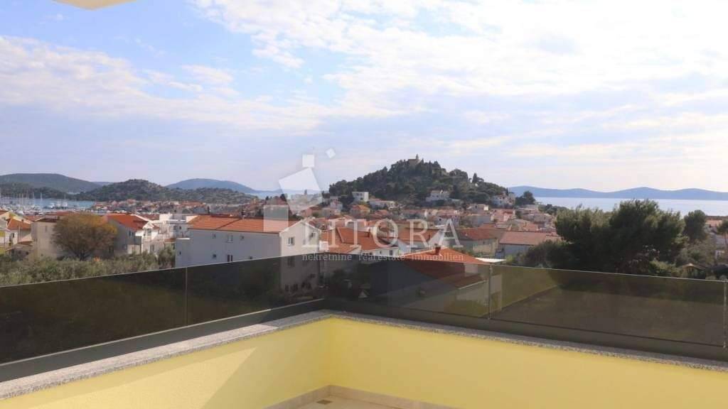 Tribunj - Modernes Doppelhaus mit Panoramablick auf das Meer. An einer ruhigen und attraktiven Lage in Tribunj befindet sich ein elegantes Doppelhaus, das für vollkommene Wohnqualität und Komfort entworfen wurde. Das Haus erstreckt sich über drei Ebenen - Erdgeschoss, erstes und zweites Obergeschoss - mit einer gesamten Nutzfläche von 221,17 m², während das großzügige Grundstück von ca. 400 m² Privatsphäre und viel Platz zum Entspannen bietet. Der Außenbereich wird durch eine große Terrasse, einen Pool und drei Parkplätze ergänzt. Im Erdgeschoss befinden sich ein Eingangsbereich, ein Badezimmer, ein Schlafzimmer sowie eine großzügige Küche mit Ess- und Wohnbereich, von dem aus man auf die wunderschöne Terrasse und den Garten mit Pool gelangt. Dieser Bereich ist als zentraler Ort für Familienleben und Geselligkeit konzipiert. Im ersten Obergeschoss sind drei Schlafzimmer untergebracht - eines davon mit eigenem Badezimmer - sowie ein weiteres Badezimmer und eine große überdachte Terrasse mit herrlichem Meerblick. Zwei Schlafzimmer haben direkten Zugang zur Terrasse und bieten so ein besonderes Erlebnis, morgens mit dem Duft des Meeres aufzuwachen. Das zweite Obergeschoss bringt zusätzlichen Hauch von Luxus: Hier befinden sich eine Teeküche, ein Schlafzimmer, ein Badezimmer und eine beeindruckende Terrasse von 53,65 m², davon 40,60 m² überdacht. Von hier aus eröffnet sich ein unvergesslicher Panoramablick auf das Meer - der perfekte Ort zum Entspannen oder für gesellige Abende. Das Haus wird nach hohen Standards in Qualität und modernem Design gebaut und ausgestattet. Der Garten ist umzäunt und so gestaltet, dass er vollkommene Erholung bietet - vom Sonnenbaden bis zum gemütlichen Beisammensein am Pool. Lage: Ruhig gelegen und dennoch in idealer Nähe zu allen Annehmlichkeiten - nur 800 m vom Strand Zamalin und 850 m vom Ortszentrum entfernt. Die Fertigstellung und der Einzug sind für Ende 2025 geplant