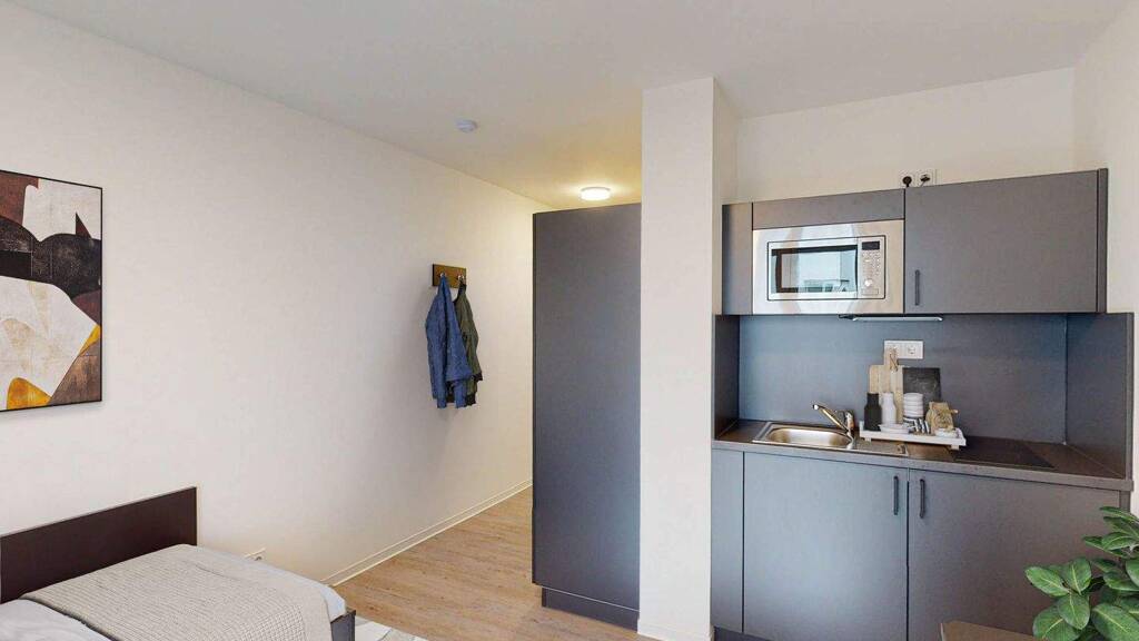 Das moderne Mikroapartment ist Teil der Apartmentanlage "SMARTS Nürnberg". Über 7 Stockwerke verteilt befinden sich 459 möblierte Apartments. Aufgrund der modernen Ausstattung und Möblierung können die neuen Bewohner des SMARTS Nürnberg unkompliziert mit dem Koffer einziehen. Wer Lust hat gleichgesinnte Mitbewohner zu treffen kann hierfür die Gemeinschaftslounge mit Zugang zur Dachterrasse nutzen. Zudem steht den Bewohnern ein Waschraum mit Waschmaschinen und Trocknern (kostenpflichtig) zur Verfügung.