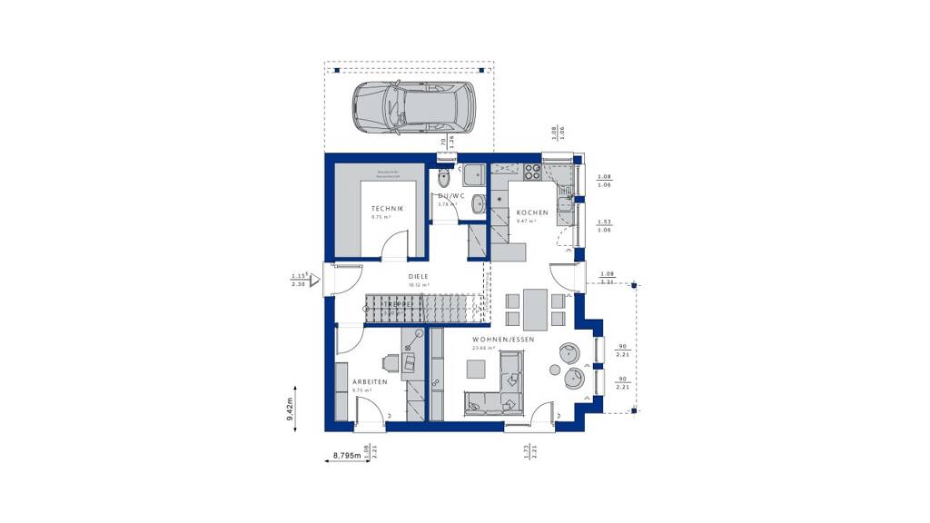 Eine charmante Außengestaltung und viel Platz im Innern: Dieses projektierte Fertighaus ist ein wahrer Wohntraum für eine vierköpfige Familie. Mit dem klassischen Satteldach - in diesem Planungsbeispiel dunkel eingedeckt - und der klaren Linienführung fügt es sich harmonisch in jedes Baugebiet ein, egal ob es sich auf dem Land oder im urbanen Umfeld befindet. Akzentuiert wird der weiß verputzte Hauptbaukörper von einem Querhaus mit Satteldach und einem Rechteckbalkon, der von filigranen Stützen getragen wird. Beide Architektur-Bauteile hüllen sich in einen sehr natürlich wirkenden Braunton. Der Balkon wird eingerahmt von einer transparenten Glasbrüstung. Sie betont nicht nur den modernen Charakter des Hauses, sondern erweist sich zudem noch als sehr langlebig und pflegeleicht. Abgerundet wird das elegante Design von bodentiefen Fensterelementen auf beiden Ebenen, die die Innenräume mit Tageslicht durchfluten. Dank der offenen Raumaufteilung im Erdgeschoss kann sich die Sonne in jeden Winkel ausbreiten. Bereits in der Diele bemerkt man das luftig-leichte Ambiente, das den Innenbereich prägt. Rechts neben dem Eingang liegt ein geräumiger Technikraum inklusive Abstellfläche für all die Dinge, die man nicht täglich benötigt. Links befindet sich ein flexibel nutzbares Zimmer. Auf den knapp 10 m² könnte ein ruhiges Büro, ein Gästezimmer oder ein zusätzliches Kinderzimmer entstehen. Später lässt sich hier auch das Schlafzimmer platzieren. Dank des Duschbads ist so ein barrierefreies Leben auf einer Ebene möglich. Über einen breiten Durchgang schließt sich der weitläufige Wohn-, Ess- und Kochbereich an, der ganz den gemeinschaftlichen Aktivitäten der Familie gewidmet ist. Privatsphäre finden die Bewohner im Dachgeschoss, das die Individualräume beherbergt. Die Dachschrägen verleihen den Räumen Gemütlichkeit. Die großzügige Wohnfläche von knapp 69 m² sorgt dabei für Bewegungsfreiraum und bietet ausreichend Stellmöglichkeiten für die Möbel. Zwei Kinderzimmer, ein Elternschlafraum mit offen angeschlossenem Ankleidebereich und ein großes Familienbad bieten alles, was eine vierköpfige Familie zum Leben und Wohlfühlen braucht.