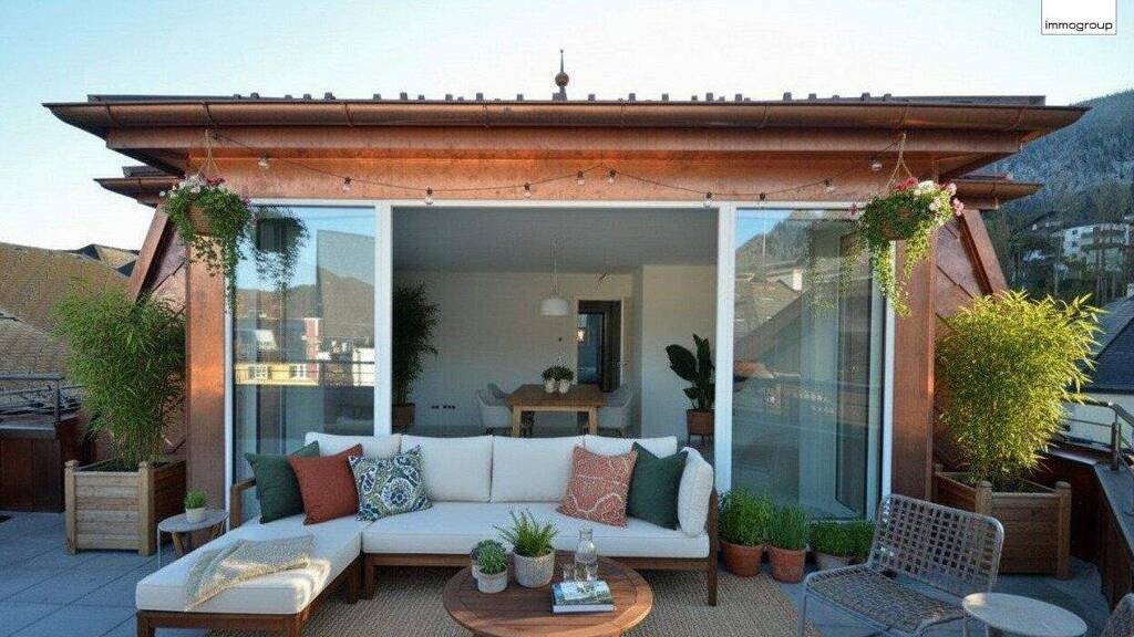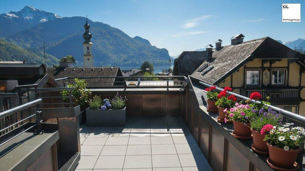 Das Penthouse befindet sich in einem modernen Wohngebäude im Zentrum von St. Gilgen und bietet einen atemberaubenden Blick auf den Wolfgangsee und die umliegenden Berge.