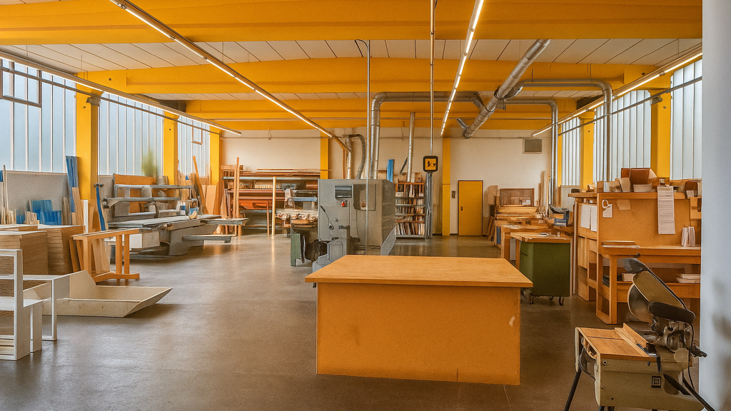 Die großzügige Gewerbeeinheit wird derzeit als professioneller Schreinereibetrieb genutzt.