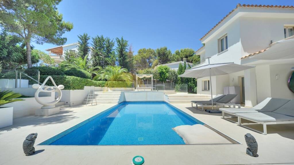 Die erst kürzlich kernsanierte Meerblick Villa ist ruhig, aber dennoch zentral in Santa Ponsa gelegen. Die Villa bietet 4 Schlafzimmer und 4 Bäder en-suite sowie ein Gäste-WC auf einer Wohnfläche von 350 m2. Das herrliche Garten-Grundstück hat eine Fläche von insgesamt 1.380 m² sowie eine Terrassenfläche von insgesamt 120 m2.