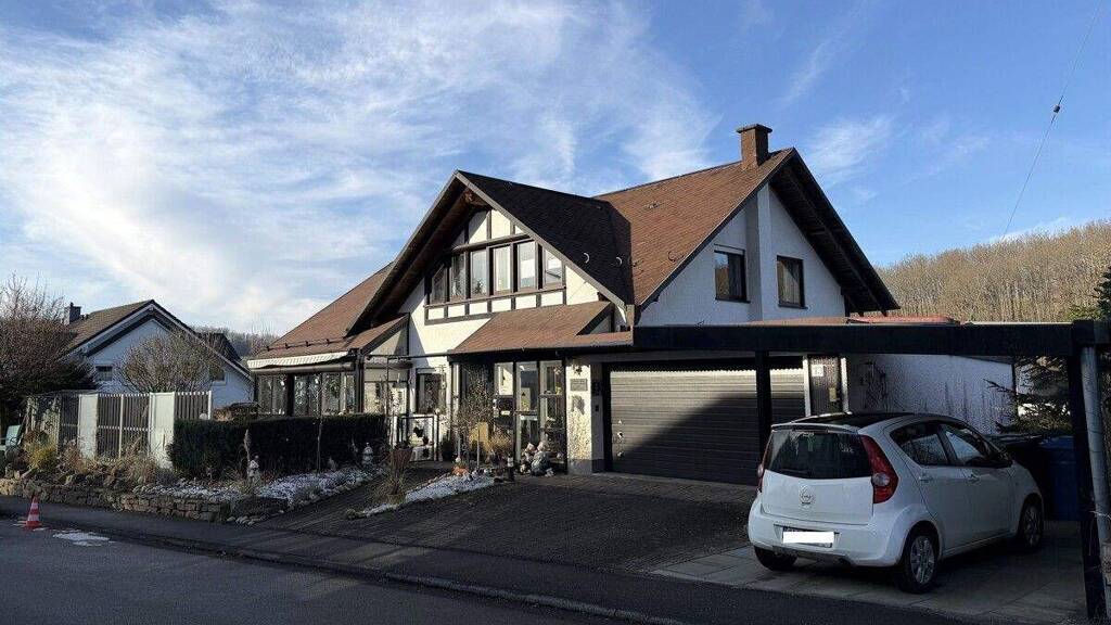 Das im Jahr 1993 errichtete Wohnhaus befindet sich in ruhiger Wohnlage von Wilnsdorf-Flammersbach und steht auf einem über 848 m² großen Grundstück. Die Grundstücksfläche bietet eine angenehme Größe mit ausreichend Platz für Kinder zum Spielen oder für ruhige Rückzugsmöglichkeiten im Außenbereich. Neben der gepflegten Wiesenfläche ergänzt eine sonnige Terrasse vor dem Haus den Wohnbereich ideal. Eine Garage mit direktem Zugang ins Gebäude sowie ein Carport sorgen für komfortable Stellplätze und kurze Wege. Die Immobilie teilt sich in eine großzügige Hauptwohnung im Erd- und Dachgeschoss sowie eine Einliegerwohnung mit separatem Eingang im Untergeschoss auf. Alle drei Etagen sind mit einer Fußbodenheizung ausgestattet. Die Hauptwohnung umfasst rund 196 m² Wohnfläche. Sie bietet eine moderne Essküche, ein Schlafzimmer, ein Duschbad sowie einen weitläufigen Wohnbereich mit Kamin und Zugang zum Balkon. Von Küche und Wohnzimmer aus ist der Wintergarten erreichbar, der über eine zusätzliche Treppe die Galerie und den Wohnbereich im Dachgeschoss erschließt und zugleich Zugang zur Terrasse ermöglicht. Insgesamt stehen in der Hauptwohnung drei Bäder zur Verfügung - ein Duschbad im Erdgeschoss sowie zwei weitere Bäder im Dachgeschoss. Die Einliegerwohnung im Untergeschoss verfügt über etwa 99 m² Wohnfläche, drei Zimmer, eine Küche sowie zwei Bäder. Sie ist derzeit für 1.100 € Kaltmiete vermietet; ein Auszug der Mieter wird voraussichtlich im Laufe des Jahres erfolgen, sodass die Einheit mittelfristig für eine Eigennutzung oder Neuvermietung bereitsteht.