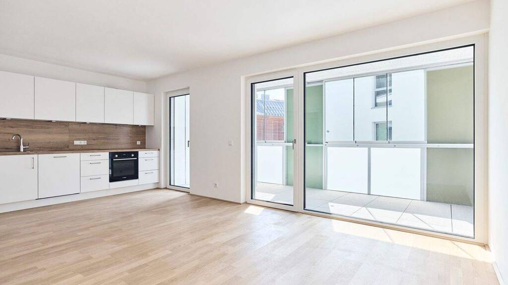 Hierbei handelt es sich um eine vermietete Eigentumswohnung mit idealem Schnitt für langfristige Nutzung. Die rund 72?m² Wohnfläche verteilen sich auf einen zentralen Wohn-/Essbereich, zwei Schlafzimmer, Bad mit Wanne, Abstellraum und Vorraum. Die Wohnung ist vollständig ausgebaut und mit einer Einbauküche versehen - sofortige Mieteinnahmen inklusive. Besonders attraktiv ist der westlich gelegene Balkon mit teilverglaster Front und praktischem Stauraum, der die Wohnfläche um über 14?m² ergänzt.
