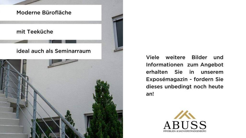 Möbel rein und los geht es. Das ist das Motto dieser modernen klimatisierten Büroeinheit im ostlichen Gewerbegebiet von Gernsheim. Durch die gute Anbindung und gepflegte Außenanlage eignet sich das Mietangebot aber auch für Schulungs- oder Weiterbildungszwecke jeglicher Art. Ob Sie also einen neuen Standort für Ihre Firma suchen oder die Räumlichkeiten zum Beispiel für Kurse und Seminare anmieten möchten, Ihre Suche können Sie nun beenden.