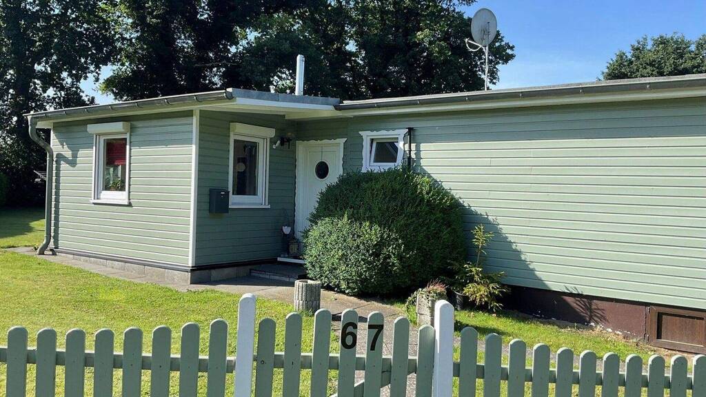 Erbaut wurde diese Immobilie in Holzständerbauweise auf ca. 605 m² Pachtland. Die Wohnfläche beträgt ca. 71 m² zzgl. Terrasse (teils überdacht) von ca. 24 m². Die Pacht beträgt jährlich € 4.840,- hinzu kommen noch die üblichen Betriebsnebenkosten. Der Pachtvertrag wird auf 10 Jahre abgeschlossen. Nach Ablauf dieser 10 Jahre verlängert sich der Pachtvertrag immer um jeweils ein weiteres Jahr. Ein Kauf des Grundstückes ist nicht möglich. Das Haus befindet sich in einem guten, gepflegten und zeitgemäßen Zustand. Eine Terrasse zur Süd-/Westseite sowie die gärtnerisch gestaltete Außenanlage runden den idyllischen Eindruck ab. Ein Gartenholzhaus sowie diverse Abstellmöglichkeiten sind vorhanden. Über den Eingangsbereich gelangt man in den zentralen Flur. Von hier ab gelangt man in den gemütlichen Wohnbereich mit anschließender Einbauküche, die 3 Schlafzimmer und das 2015 modernisierte Duschbad. Das Dach wurde 2015 neu abgeschweißt, die Fassade in 2022 neu gestrichen. Beheizt wird das Haus über E-Heizkörper, ein Kaminofen ist aber auch vorhanden. Die genaue Aufteilung der Räume entnehmen Sie bitte dem Grundriss.