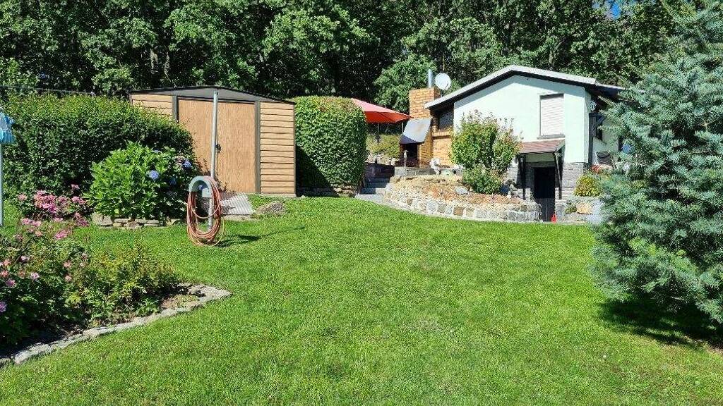 Die liebevoll gepflegte Außenanlage beeindruckt mit einer Vielfalt an Pflanzen- und Straucharten, einem Teich mit Seerosen, Fischen und einem Springbrunnen. Ein massiver Außenkamin mit Räucherkammer lädt zu geselligen Abenden ein. Besonders hervorzuheben ist der hinter dem Hang eingebaute Keller, welcher immer schön kühl bleibt.