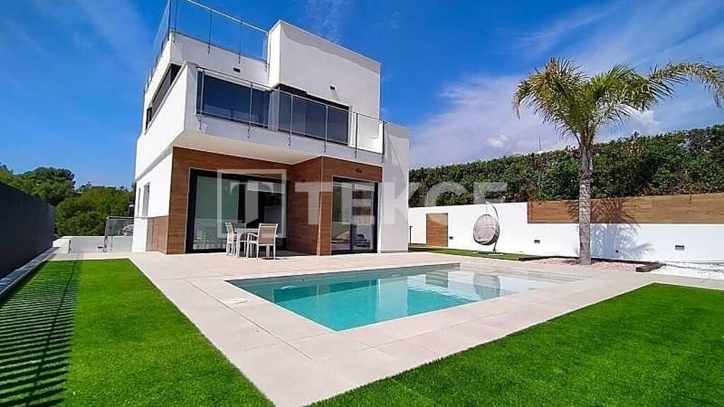 Diese stilvollen Villen zum Verkauf in Alicante sind elegant eingerichtet und bieten eine Fülle von Ausstattungsmerkmalen. Dazu gehören ein erfrischender Pool, eine geräumige Garage, eine praktische Waschküche, eine einladende überdachte Terrasse und eine malerische Sonnenterrasse mit fesselndem Meerblick. Das Innendesign umfasst ein großzügiges Untergeschoss, das für verschiedene Zwecke genutzt werden kann. Zu den bemerkenswerten Merkmalen gehören drei Bäder und drei Schlafzimmer, von denen zwei als Suiten mit direktem Zugang zu einer Terrasse dienen. Das geräumige Wohnzimmer harmoniert mit einem gut angebundenen Essbereich, der nahtlos in eine offene Küche übergeht. Die voll ausgestattete Küche verspricht kulinarische Köstlichkeiten, und ein optionaler Aufzug erhöht den Komfort dieser exquisiten Villen noch weiter.