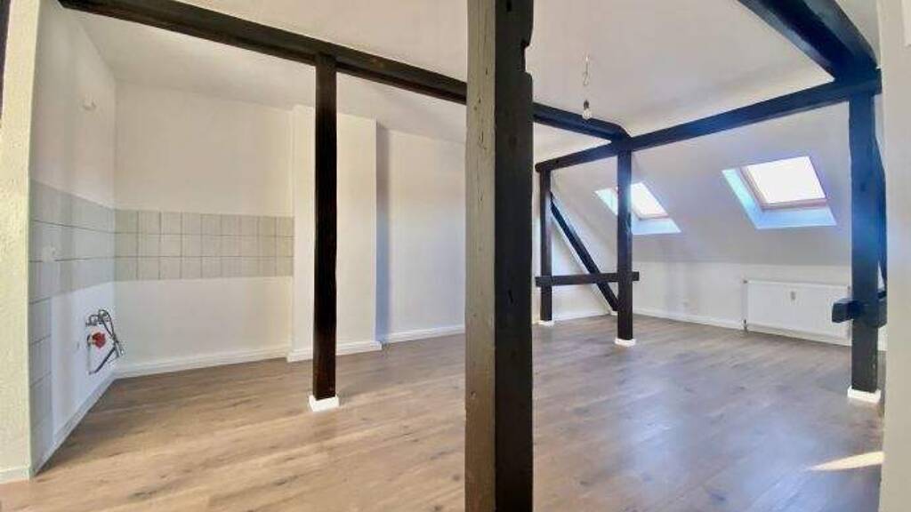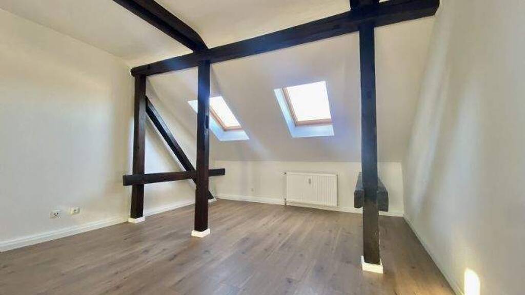 Diese sanierte 1-Zimmer-Dachgeschosswohnung besticht durch ihren besonderen Charme und eine effiziente Raumnutzung, die ideal auf die Bedürfnisse von Singles oder Pendlern zugeschnitten ist. Das offene Wohnkonzept vereint den Flurbereich, die Küchenzeile sowie den Wohn- und Schlafbereich harmonisch in einem lichtdurchfluteten Raum. Sichtbare, aufbereitete Holzbalken verleihen dem Apartment hierbei eine gemütliche und gleichzeitig moderne Loft-Atmosphäre, während die ruhige Lage für eine entspannte Wohnqualität sorgt.
