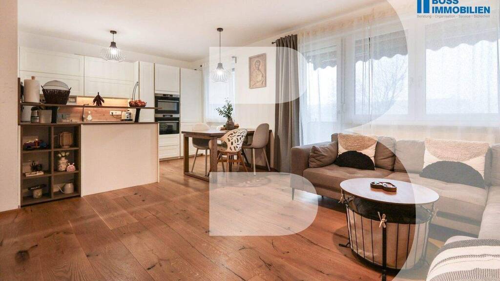 Das Herzstück der Wohnung ist der großzügige Wohnbereich mit direktem Zugang zur sonnigen Loggia - perfekt, um entspannte Stunden im Freien zu genießen. Große Fensterflächen durchfluten die Räume mit Tageslicht und schaffen ein helles, einladendes Wohnambiente.