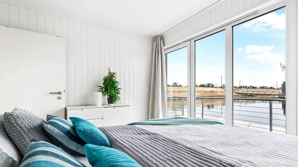 Dieses schwimmende Ferienhaus bietet seinen Gästen einen Urlaub der Extraklasse! Auf zwei Etagen bietet dieses Haus zwei Schlafzimmer, einen großzügigen offenen Wohn- und Essbereich mit voll ausgestatteter Küche und drei Terrassen. Die Dachterrasse mit Strandkorb gehört zu den Highlights des Hauses und bietet einen traumhaften Ausblick über den Hafen von Olpenitz! Der Wohn- und Essbereich mit der hochwertigen offenen Küche bietet Zugang zur angeschlossenen Terrasse im 1. Obergeschoss. Die Schlafzimmer bieten jeweils ein Doppelbett sowie einen atemberaubenden Blick aufs Wasser. Die finnische Sauna und das gegenüberliegende Badezimmer mit einer ebenerdigen Dusche laden auch bei schlechtem Wetter zu einem ausgiebigen Wellnessabend mit besonderem Ausblick ein. Ein Pkw-Stellplatz befindet sich am Steg, nur wenige Meter vom Haus entfernt. Dieses schwimmende Haus verfügt aber zudem auch über einen Bootsanleger direkt am Haus.