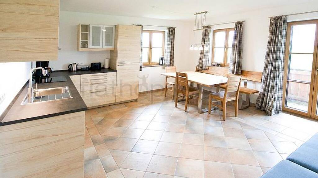 Helle Wohnküche komplett ausgestattet, mit großem Holztisch und Doppelschlafcouch mit Flat-TV. Große Küche mit Kühl-/ Gefrierkombi, Spülmaschine, Kaffeemaschine und reichlich Stauraum. Zugang zum Balkon, mit Balkonmöbeln und Blick in die Alpen.