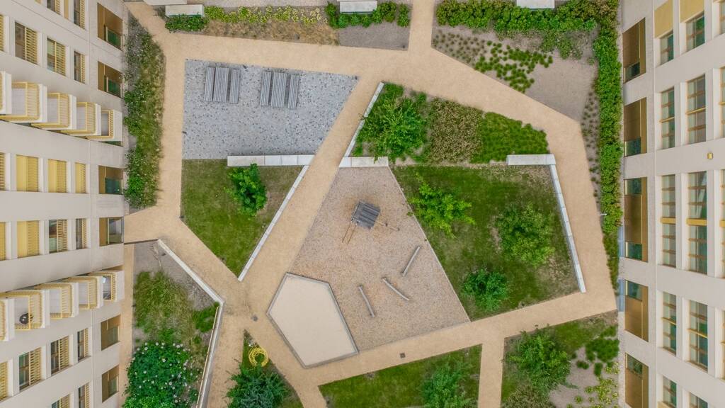 Genießen Sie den Vorteil eines ruhigen, begrünten Innenhofs mit Sitz- und Spielmöglichkeiten, der exklusiv den Bewohnern zur Verfügung steht und eine perfekte Oase der Ruhe inmitten des urbanen Lebens bietet. Große Fensterfronten sorgen für lichtdurchflutete Räume und schaffen eine angenehme Atmosphäre.