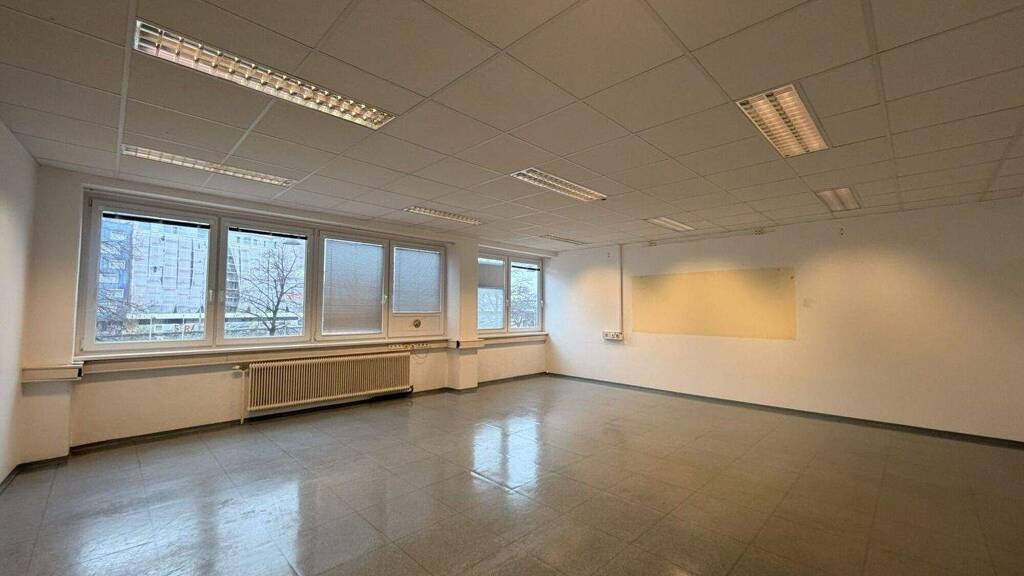 - Pflegeleichter Fliesenboden - Große Fensterflächen für viel Tageslicht - Abgehängte Decke mit integrierten Rasterleuchten - Gleichmäßige, blendfreie Deckenbeleuchtung - Kabelkanäle entlang der Wände - Mehrere Strom- und Datenanschlüsse - Beheizung über Heizkörper