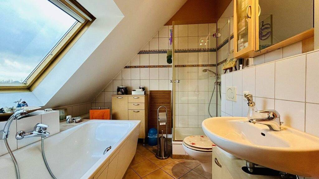 Das moderne Tageslichtbad im oberen Geschoss ist mit einer komfortablen Duo-Badewanne sowie einer separaten Duschkabine ausgestattet.