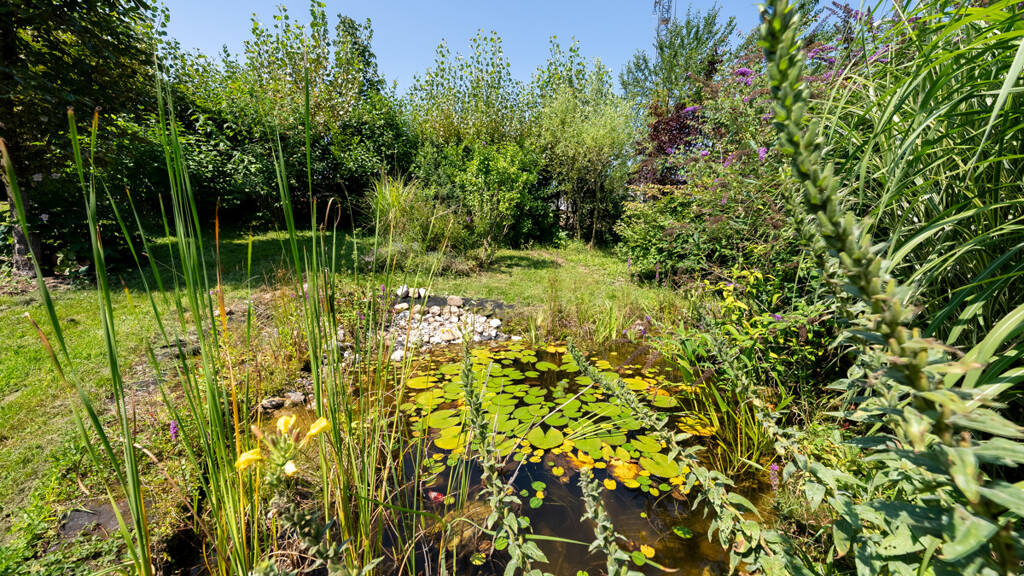 Ein idyllisches Biotop, eine gemütliche Gartenhütte, ein buntes Gemüsebeet und alte Obstbäume schaffen eine Oase zum Gärtnern, Entspannen und Genießen - ideal für gemeinsame Stunden mit Familie, Freunden und Haustieren.