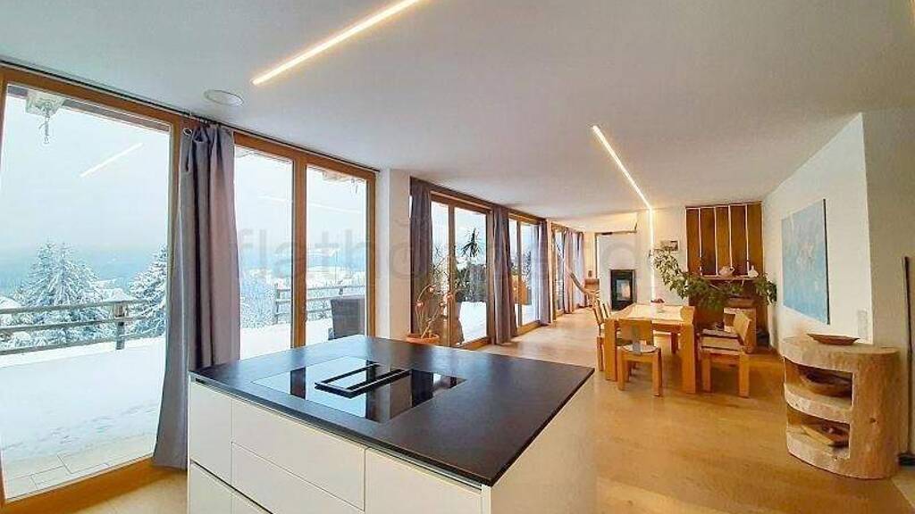 Durch die durchgängige Fensterfront bietet sich ein unglaublicher Blick ins Leitzachtal. Das Gefühl sich direkt in der Natur zu befinden wird unterstützt durch das hochwertige Eichenholzparkett, Echtholzmöbel und Holzskulpturen welche eine angenehmes Raumklima schaffen.