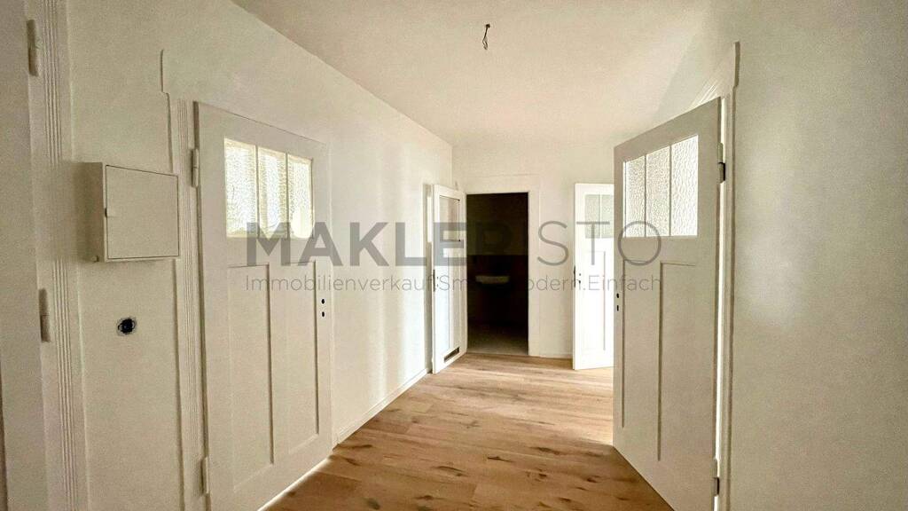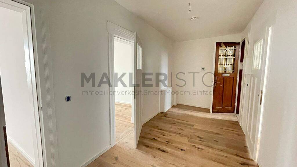 Dabei werden sämtliche Fußböden erneuert und die Wände nach modernstem Standard gespachtelt. Das Wohn- und Schlafzimmer sowie der Flur erhalten einen hochwertigen Fußbodenbelag mit exklusiven Holzdielen im Landhausstil. In Bad und Küche werden moderne Fliesen verlegt, während das innenliegende Badezimmer mit einer Badewanne sowie einer Dusche, einem Handtuchheizkörper und einen Waschmaschinenanschluss ausgestattet ist. Deckenspots wurden im Flur, Bad und in der offenen Küche integriert.