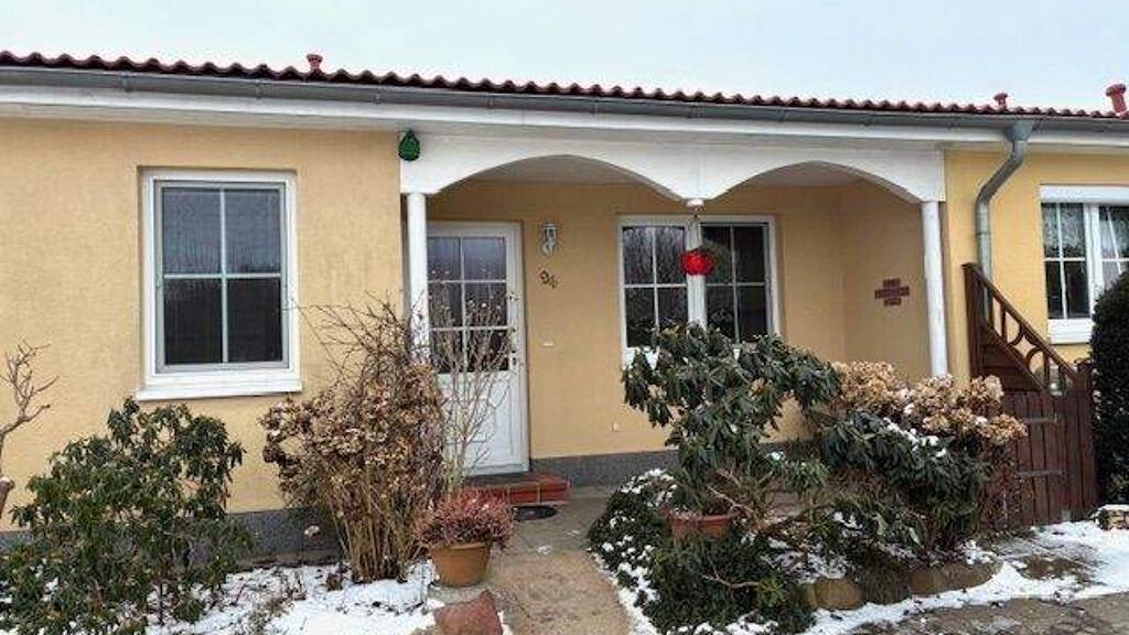 Die Wohnebene teilt sich auf in Eingangsflur, Bad mit Fenster, Wanne und Dusche, Wohnzimmer mit sich anschließendem Wintergarten, ein Schlafzimmer, ein zweites Schlaf-, Gäste-, oder Arbeitszimmer, HWR und Küche mit Einbauküche. Das Bad wurde 2025 modernisiert und hat eine ebenerdige Dusche erhalten. Die Wohnfläche wird durch einen in Südlage befindlichen Wintergarten komplettiert. Von hier gelangt man über einen gepflasterten Weg zu einem Gartenhäuschen.