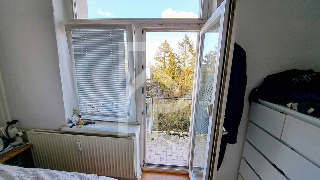 Der helle große Wohn-/ Esszimmerbereich ist durch eine doppelflügelige Tür getrennt. Über das Schlafzimmer gelangen Sie auf den kleinen Balkon und können von hier den Blick über die Dächer bis hin zur Flensburger Förde genießen.