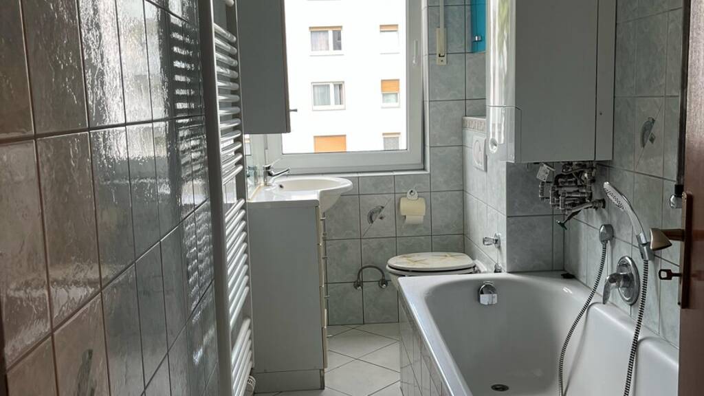 Eine einfache, funktionale Küche sowie drei weitere Zimmer runden das Raumangebot ab. Das Badezimmer ist mit einer Gas-Etagenheizung ausgestattet. Ein Balkon ist ebenso vorhanden.