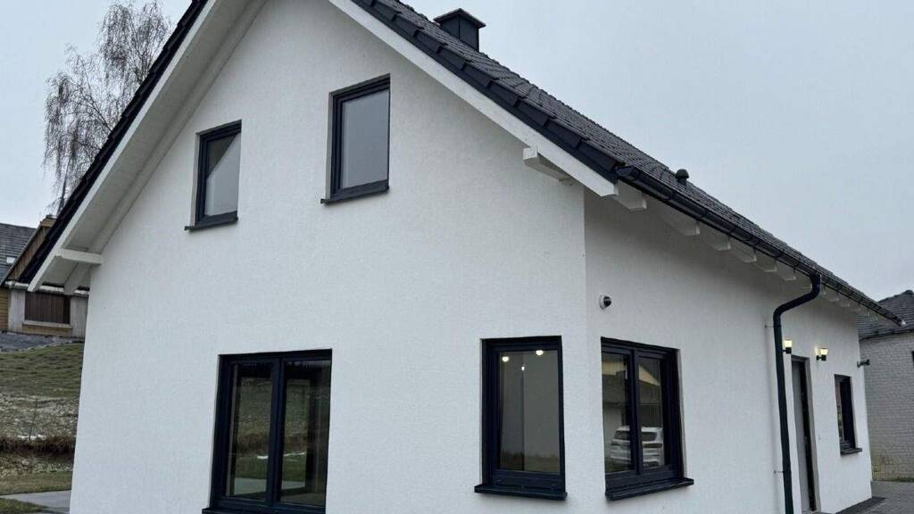 Dieses neu errichtete, moderne Einfamilienhaus überzeugt durch seine lichtdurchflutete Architektur, eine durchdachte Raumaufteilung sowie eine hochwertige Ausstattung  ideal für Familien oder anspruchsvolle Paare, die modernes Wohnen im Grünen schätzen. Bereits beim Betreten des Hauses empfängt Sie ein großzügiger Eingangsbereich. Das Erdgeschoss besticht durch einen offenen, hellen Wohn- und Essbereich mit integrierter Küche, der ein angenehmes Wohnambiente schafft. Ein Kaminanschluss im Wohn- und Essbereich bietet die Möglichkeit, zusätzlich eine behagliche Atmosphäre zu schaffen. Ergänzt wird das Erdgeschoss durch ein separates Arbeitszimmer, einen praktischen Hauswirtschaftsraum sowie ein Duschbad mit Fenster. Ein weiterer Abstellraum unter der Treppe sorgt für zusätzlichen Stauraum. Im Obergeschoss stehen Ihnen drei großzügig geschnittene Schlafzimmer zur Verfügung. Zwei der Schlafzimmer bieten einen direkten Zugang zur großzügigen Dachterrasse, die einen wunderschönen Ausblick ins Grüne eröffnet. Die Dachterrasse ist hochwertig mit Bankirai-Holz belegt; ein Geländer aus Edelstahl mit Glasfront wird derzeit noch fachgerecht nachgerüstet. Das geräumige Tageslichtbad im Obergeschoss lässt keine Wünsche offen und verfügt über zwei Waschbecken sowie eine Eckbadewannenvorrichtung - ideal für entspannte Wohlfühlmomente. Der Außenbereich rundet das Angebot perfekt ab: Eine Terrasse im Garten lädt zum Verweilen ein, während eine Gartenbewässerung für zusätzlichen Komfort sorgt. Die Garage mit elektrischem Garagentor bietet einen sicheren Stellplatz für Ihr Fahrzeug. Das Haus wird KfW-gefördert und erfüllt somit moderne energetische Standards.