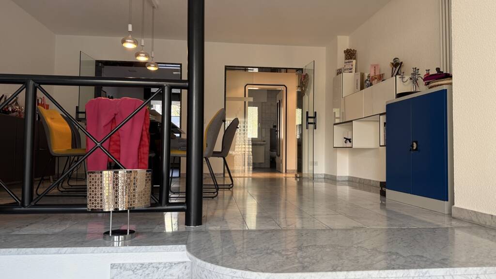 Über die einladende Diele gelangen Sie in die Küche, das Schlafzimmer sowie in das moderne, barrierefreie Badezimmer, das mit einer großzügigen bodengleichen Dusche ausgestattet ist. Herzstück der Wohnung ist der offen gestaltete Wohn- und Essbereich, der durch seine Split-Level-Anordnung architektonisch reizvoll gestaltet ist. Ein Kamin sorgt für eine angenehme Wohnatmosphäre, während der elegante weiße Marmorboden und die gasbetriebene Fußbodenheizung den hohen Ausstattungsstandard unterstreichen. Große Fensterflächen lassen viel Tageslicht in die Räume und öffnen den Wohnbereich direkt zum Garten, wodurch Innen- und Außenraum harmonisch miteinander verbunden werden.