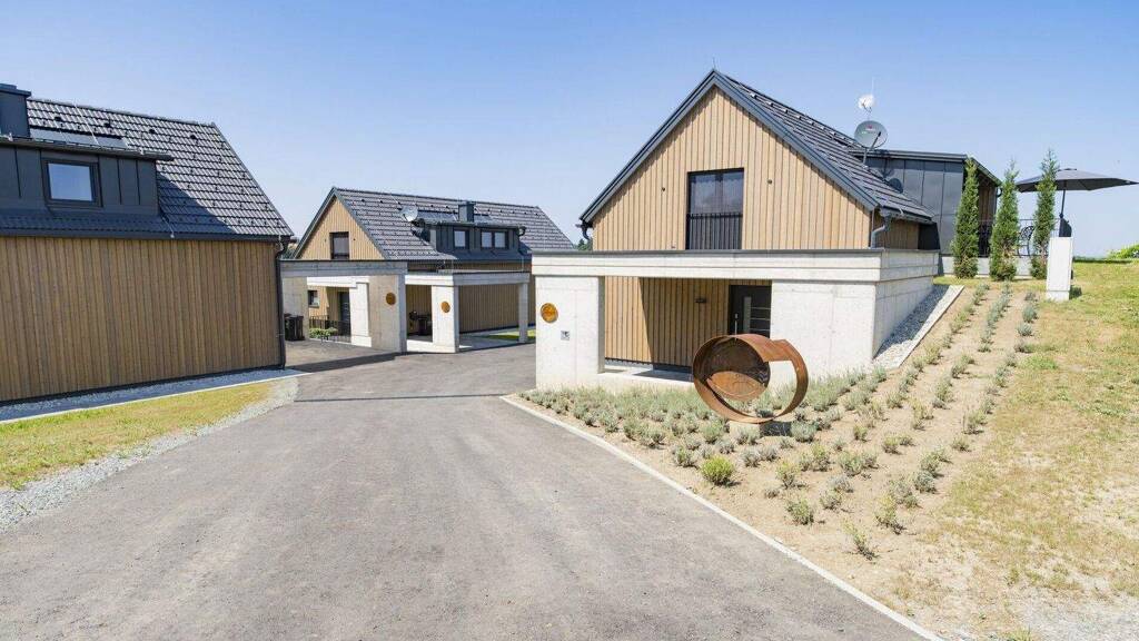 Zum Verkauf steht ein absolut traumhaftes Ferienhaus - Ensemble, in noch traumhafterer Lage mit einem Weitblick über die südsteirische Hügellandschaft bis zu den Kitzecker Weinbergen hinweg. In der Weinbaugemeinde Gamlitz, auf einer Gesamtfläche von knapp 1,7ha welche über einen Eigenwald sowie Wiesenflächen verfügt, befindet sich diese Ferienhausanlage welche 2021 neu errichtet wurde. Die 3 Wohnhäuser erstrecken sich über eine Wohn- Nutzfläche von 112 bis 115m2 und bieten jeweils einen hauseigen Wellnesbereich mit Whirlpool und Sauna sowie eine Relaxterrasse.
