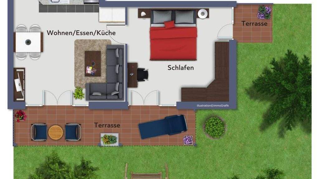 Mit ca. 47,7?m² großzügiger Wohnfläche bietet die Wohnung ausreichend Raum für Erholungssuchende. Das Herzstück bildet der offene Wohn- und Essbereich mit einer hochwertigen Markenküche, die nicht nur durch stilvolles Design, sondern auch durch erstklassige Ausstattung überzeugt. Mit viel Liebe zum Detail wurde die Einrichtung des Wohn-Essbereich harmonisch aufeinander abgestimmt und schafft eine Atmosphäre, in der Sie sich sofort wohlfühlen. Das angrenzende Schlafzimmer ist hell und verspricht mit seiner durchdachten Gestaltung wohltuende Nächte. Die sonnige Terrasse erreichen Sie über den lichtdurchfluteten Wohn-Essbereich. Sie grenzt mit dem außergewöhnlich großen Garten direkt an den Kurpark - ein echtes Highlight. Abgerundet wird Ihr neues Zuhause mit dem aufwendig renovierten Badezimmer. Es überzeugt mit moderner Duschabtrennung, eleganten Armaturen und designvollen Fliesen - ein Ort, an dem Sie jeden Tag entspannt beginnen und ausklingen lassen können.