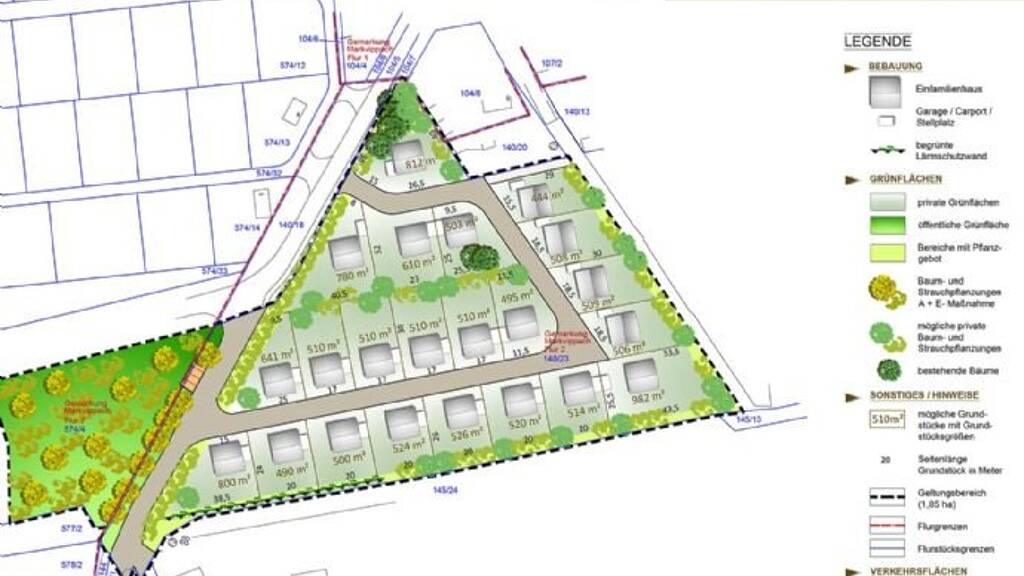 Gem. dem vorläufigen Gestaltungsplan werden planmäßig bis zu 22 Grundstücke in der Größe von 444 qm bis zu 982 qm parzelliert und sämtlich bauträgerfrei verkauft. Die Grundstücke werden im öffentlichen Raum voll erschlossen. Die privaten Hausanschlüsse von der Strassenmitte, bzw. der Grundstücksgrenze werden von den Erwerbern beauftragt.